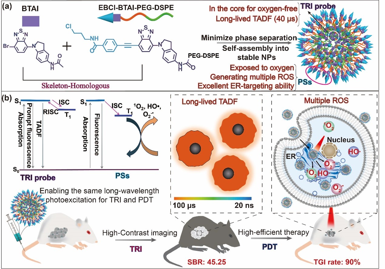 图1. 过共轭分子骨架同源性设计构建纳米材料,实现基于TADF的TRI引导PDT的示意图。(a) 具有BTAI核心(基于TADF的TRI探针)和EBCl-BTAI-PEG-DSPE外壳(暴露于氧气中的光敏剂)纳米颗粒的自组装过程。(b) 纳米颗粒用于TRI引导PDT的示意图。