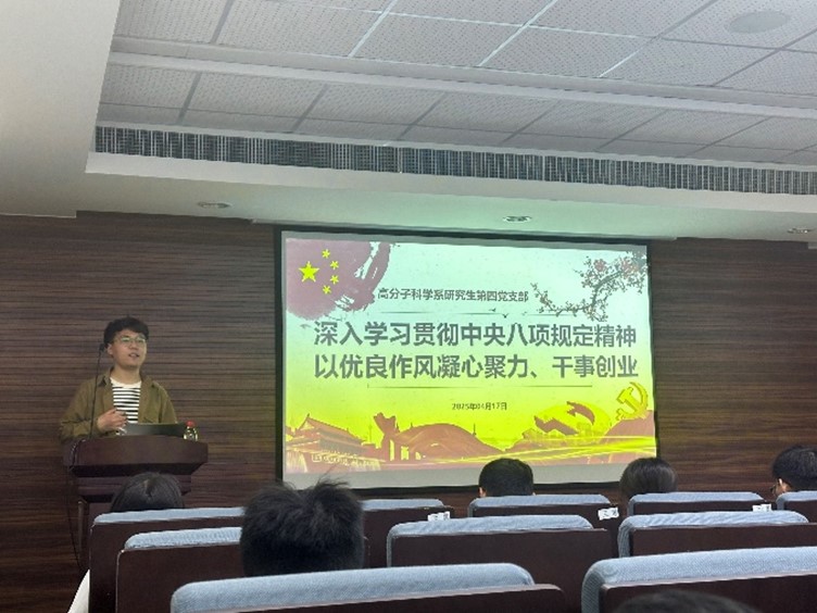 研究生第四党支部于4月17日晚在系楼B2085召开4月组织生活。本次组织生活的学习主题为“深入学习贯彻中央八项规定精神以优良作风凝心聚力、干事创业”。