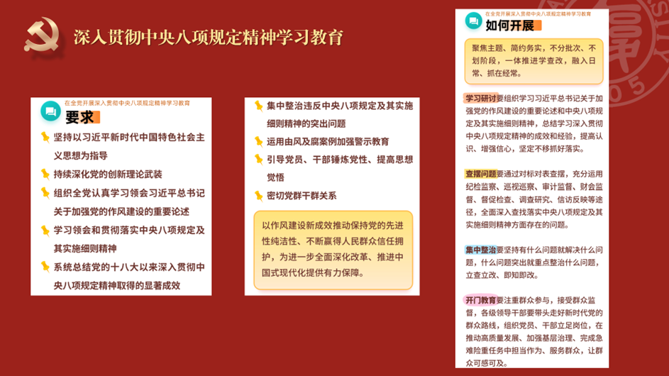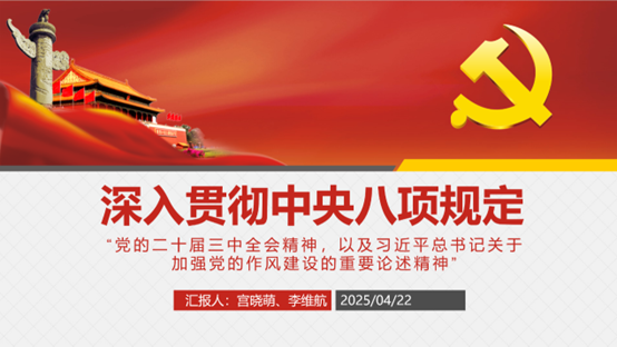 2025年3月12日,中央党的建设工作领导小组召开会议指出,党中央决定,自2025年全国两会后至7月在全党开展深入贯彻中央八项规定精神学习教育。这是巩固深化主题教育和党纪学习教育成果、纵深推进全面从严治党的重要举措,是密切党群干群关系、巩固党的执政基础的必然要求,是推进中国式现代化的有力保障。根据党中央、学校党委要求,成人tv 研究生党支部于2025年4月开展组织生活,进行系列学习,对研究生党员的作风规范进行了有效落实。