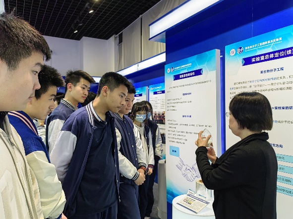 首先由丛培红老师带领师生们参观了国重室展示厅。丛老师从国重室的发展与历史沿革、科学团队与带头人、主要研究方向等内容出发,对国重室代表性研究成果如双轴拉伸聚乙烯膜、丝蛋白骨钉、冠状动脉支架和柔性纤维器件等作了详细介绍,使同学们了解“什么是国家重点实验室”,并对“什么是聚合物”有了初步印象。在讲解中,丛老师着重为同学们介绍了成人tv 高分子学科创始人——于同隐先生的事迹,让同学们感受前辈科学家的科学精神以及传承,以此勉励同学们在未来的学习和生活中勇攀科学高峰。