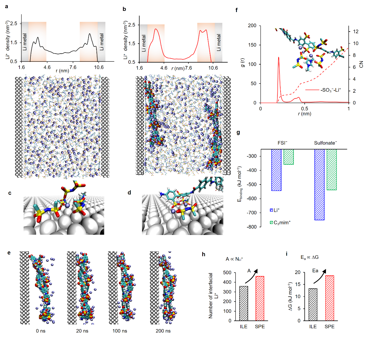 为了进一步确认纳米团簇形成的后端机制,我们采用分子动力学模拟(MDS)和密度泛函理论(DFT)来研究影响界面电荷转移动力学的物理性质。基于量子和分子动力学模拟的结果证实了Li+在SPE界面的富集效应主要源于PBDT-SO3−与Li+之间更强的相互作用,这些纳米级自组装离子团簇通过平衡锂聚合物空间电荷界面的指前因子(A)和活化能(Ea),在实现超高速电荷转移动力学中起着关键作用。