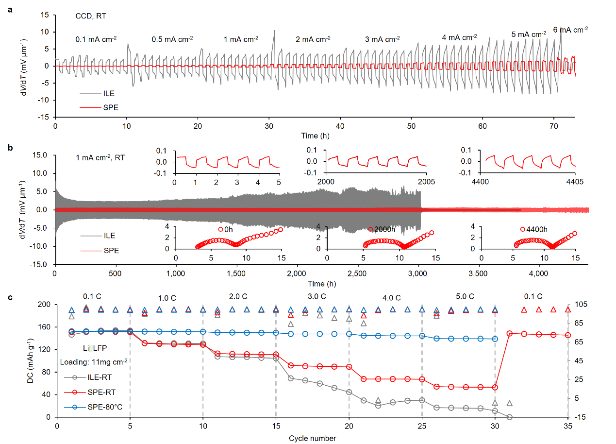 具有高的界面电荷转移动力学的SPE表现出优异的电化学性能。在室温下获得了创纪录的6 mA·cm-2极限电流密度(CCD)并表现出极低的过电位,组装的锂金属对称电池在1 mA·cm-2 (0.5 mAh·cm-2)的高电流密度下可稳定循环4500 h。同时, LFP||Li全电池也表现出良好的倍率性能,室温下3C(充放电时间为20 min)的放电比容量高达90 mAh·g-1。软包电池表现出的长期循环稳定性(2C, 520次循环后容量保持率为80%)显示出满足便携式设备和电动汽车电池等主流应用的潜力。