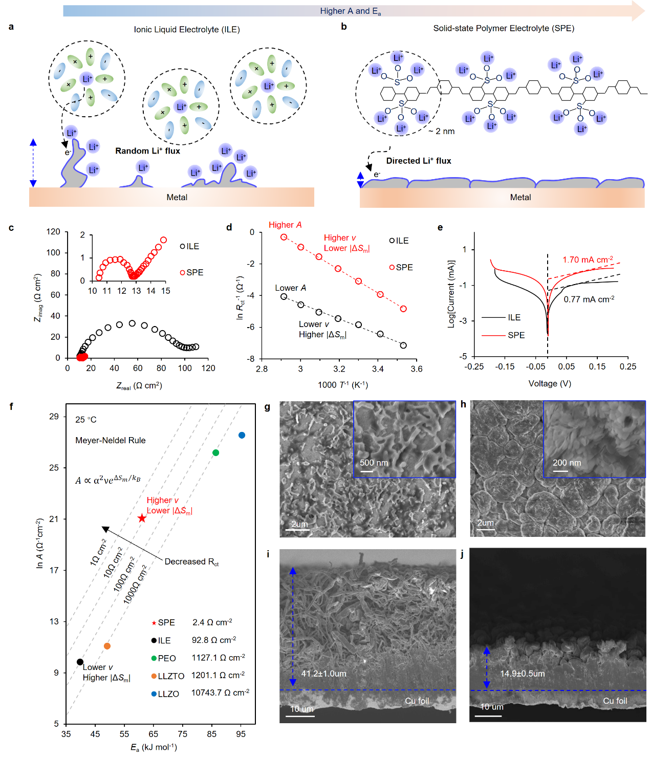 在本研究中,我们聚焦于固态锂金属电池所面临的高界面电荷转移阻抗以及不受控的锂枝晶生长等界面问题,提出了在刚性棒状聚合物(PBDT)的磺酸基周围自组装富锂离子纳米团簇的设计策略,一方面促进了锂的均匀沉积从而阻止锂枝晶的生长,另一方面通过数量级增加的Arrhenius方程指前因子(A)实现了迄今为止固态电解质中报道的最低的界面电荷转移电阻(2.4 Ω·cm2)。