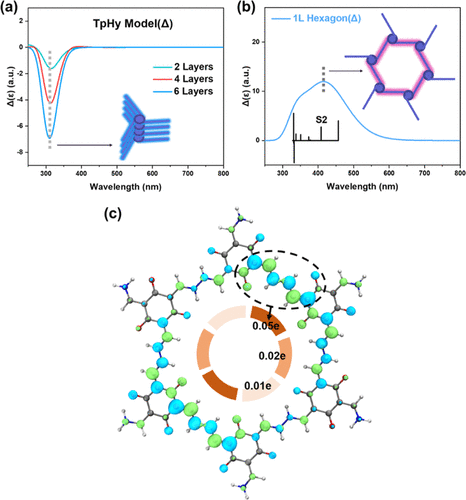 严格的二维平面理应无法实现全局手性,而手性酮烯胺COF实际由准二维片层形成。经过统计分析一系列具有相似结构的小分子单晶,作者发现手性残基能够导致烯醇/酮烯胺结构发生对映选择性的轻微扭转。经由手性残基的诱导,如此准二维结构最终稳定在酮烯胺COF的晶体场内。其中显著的面内对称破缺主导了手性COF对圆偏振光的响应。基于簇模型的量子化学计算,分子结构的不对称性导致了激子在面内的不对称分布,从而使材料表现出圆二色活性。短波、长波的相反圆偏振光吸收活性分别归因于COF中的酮烯胺构筑结点与随之形成的纳米六元环。形象地讲,这两种准分子结构的关系就像用一圈凸起的阳模围出一个阴刻图案,自然两者呈现的是相反效果,体现出矛盾的对立统一。