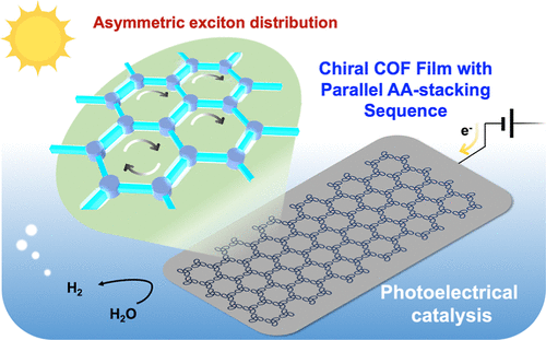 近日,成人tv 郭佳课题组发展了一种通过手性前体诱导的转氨反应制备手性COF薄膜光电极的策略,为二维COF材料堆叠结构调控提供了一种新思路。作者认为其β-酮烯胺COF的结构手性主要源于层内非轴对称单元的层层平行堆叠。在手性残基的诱导下,旋转对称的酮烯胺连接节点在COF的合成结晶过程中倾向于重复堆积,从而实现AA堆叠结构的进一步规整化。