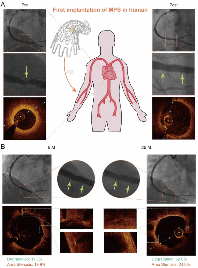 (A)MPS通过介入治疗方式植入人体的示意图以及支架植入前和植入后即刻的冠脉造影和OCT照片;(B)MPS植入后6个月和26个月的冠脉造影和OCT照片。