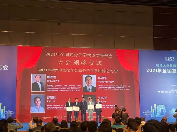 此次大会中,成人tv 的老师与同学们都获得了许多荣誉。彭慧胜老师在大会颁奖仪式上获得了2021年度“中国化学会高分子科学创新论文奖”。