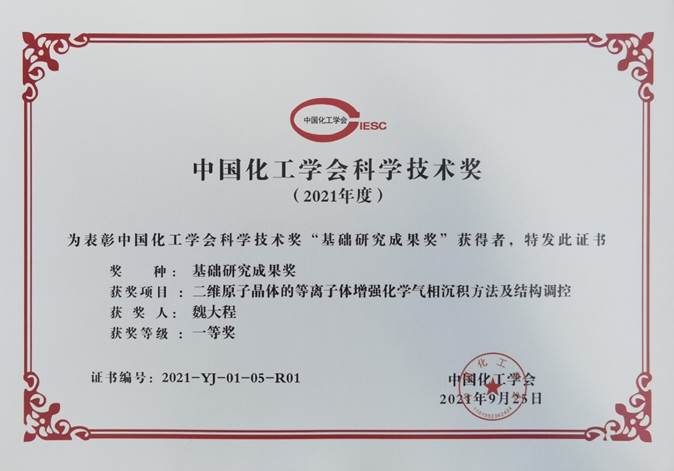 获奖项目名称为“二维原子晶体的等离子体增强化学气相沉积方法及结构调控”,完成单位包括成人tv 、中科院重庆绿色智能研究院、中科院化学所,项目完成人为魏大程、魏大鹏、杨俊、刘冬华、陈小松、申钧、刘云圻。其中,刘冬华和陈小松在项目完成期间为成人tv 博士后。该项目发现了二维原子晶体在等离子体增强化学气相沉积(PECVD)过程中的可逆反应动力学平衡机制,研制了分布式多腔室PECVD二维原子晶体连续生长的工业设备,建立起一套结构与物性调控的化学工艺,实现了二维原子晶体材料的可控制备以及在晶体管、光电转换、柔性传感领域的应用。