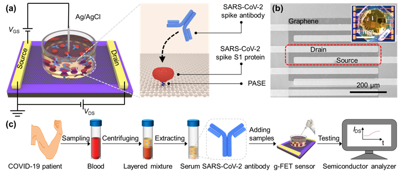 研究发现,将新冠病毒刺突蛋白通过化学方法修饰在石墨烯传感界面,石墨烯场效应晶体管(g-FET)能有效地将新冠抗体与刺突蛋白的特异性结合转变成沟道电导的变化,进而实现对新冠抗体的超灵敏检测,检测限低至2.6 aM(1 aM = 10−18 M),相当于100 μL血清中大约150个抗体分子的浓度。经临床血清样品验证,该g-FET能准确分辨出阳性和阴性新冠患者,最快诊断时间低至2分钟。检测结果可直接从电学响应中读出,不需要复杂的操作或数据处理。这种检测芯片通过半导体加工工艺制造,成本相对较低,方便集成到便携式系统中,为现场和即时检测新冠病毒提供了很大的希望,使人们能够在海关、车站、诊所、家中甚至互联网上监测感染状况,减少交叉感染的风险。