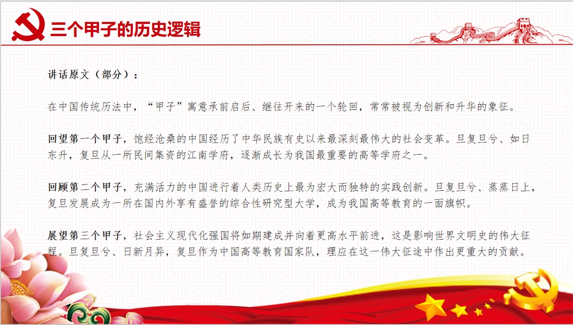 研究生第三党支部支部书记郑浩同志带领支部同志开展理论学习,他提到“创新是复旦与生俱来的基因”、“创新型大学要为人的创造性发展提供无限可能”等内容,接着带领大家线上集体观看了成人tv 120周年校庆金力校长讲话,学习讲话中“三个甲子的历史逻辑”、“创新基因的文化内核”、“创新型大学的实践要求”三大核心要点,并结合校史馆线上资源,简要梳理讲话中“历史-现实-未来”的逻辑主线,强调“创新是贯穿双甲子的不变主题”。随后,支部宣传委员欧凯琴同志总结了如“创新是复旦与生俱来的基因”“创新型大学要为人的创造性发展提供无限可能”“突破边界需要改革的勇气”等相关金句,分享给全体支部党员共同学习。