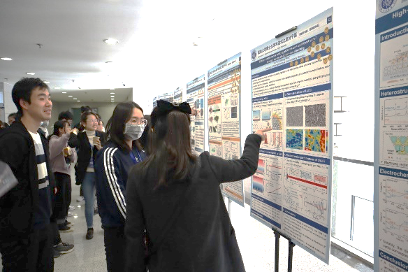 随后,论坛进入了茶歇和墙报展示交流环节。各位评委与观众共同来到先进材料楼二楼进行墙报学术交流。期间评委及现场观众打分,共评选出最佳墙报奖10名。茶歇环节结束后,成人tv 汪群松、张鑫饶、张艳三位同学就聚合物封堵器、硅基纳米颗粒等领域做了相关汇报,成人tv 俞麟老师高度肯定了三位同学的科研工作并鼓励大家要继续再接再厉,勇攀科研高峰。