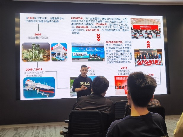 随后,埃克森美孚亚太区研发经理、1998级化学系校友David向大家对公司作简要介绍。他展示了埃克森美孚可追溯到1882年洛克菲勒创立的标准石油公司,至今已有百年历史,现在拥有超过60000名员工,业务横跨六大洲。目前公司的业务覆盖了从上游到下游的全产业链,上游包括石油的勘探、采集等,下游含盖产品方案业务,如聚乙烯、聚丙烯产品配方研究等,以及最新的结合国家碳达峰、碳中和战略的低碳方案业务。David学长还介绍了埃克森美孚在中国的发展历程,1892年就已经在中国开始售卖煤油灯,改革开放以后逐渐参与国内能源行业的许多领域的业务,2011年上海研发中心投入运营,2020年启动了在广东大亚湾的新技术中心项目。