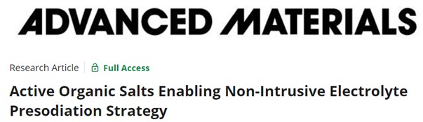 文献详情:Chen, S., Wu, G., Wang, P. et al. Active Organic Salts Enabling Non-Intrusive Electrolyte Presodiation Strategy. Adv. Mater. 2025, 37, 2502251