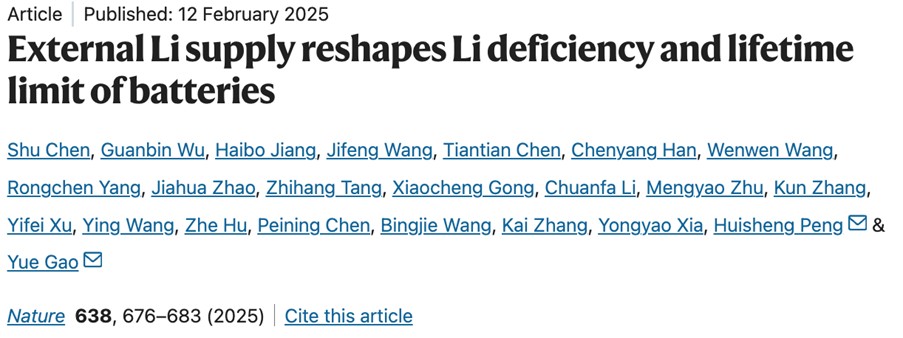 文献详情:Chen, S., Wu, G., Jiang, H. et al. External Li supply reshapes Li deficiency and lifetime limit of batteries. Nature 2025, 638, 676–683.