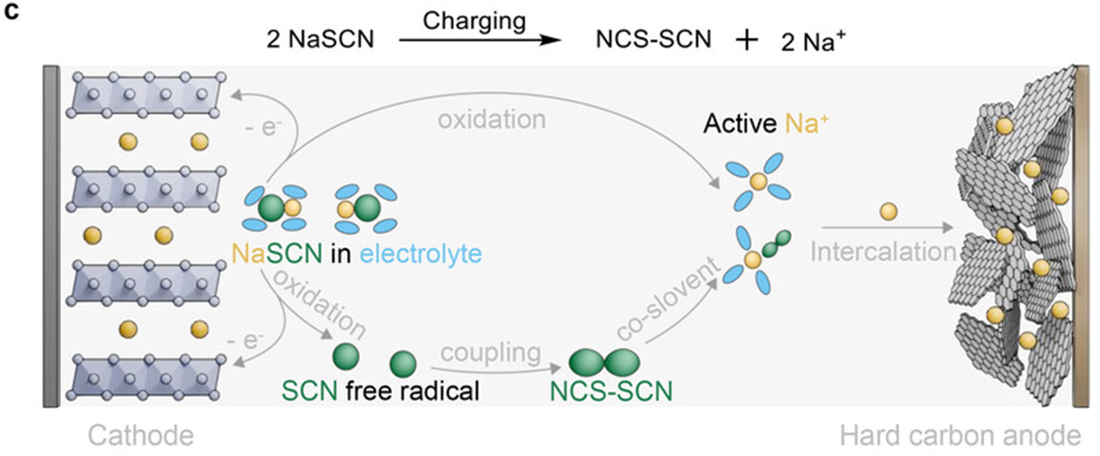 团队通过化学信息学与无监督机器学习协同筛选,从120个候选分子中发掘硫氰酸钠(NaSCN),开创无损伤电解液预钠化新路径。该盐在3.3–4.0 V窗口内不可逆氧化,释放钠离子同时生成NCS-SCN共溶剂,全程无有害残留。在硬碳|P2-Na2/3Ni1/3Mn1/3Ti1/3O2软包电池中,首效从80.8%跃升至95.2%,为钠离子电池实用化注入强劲动力。