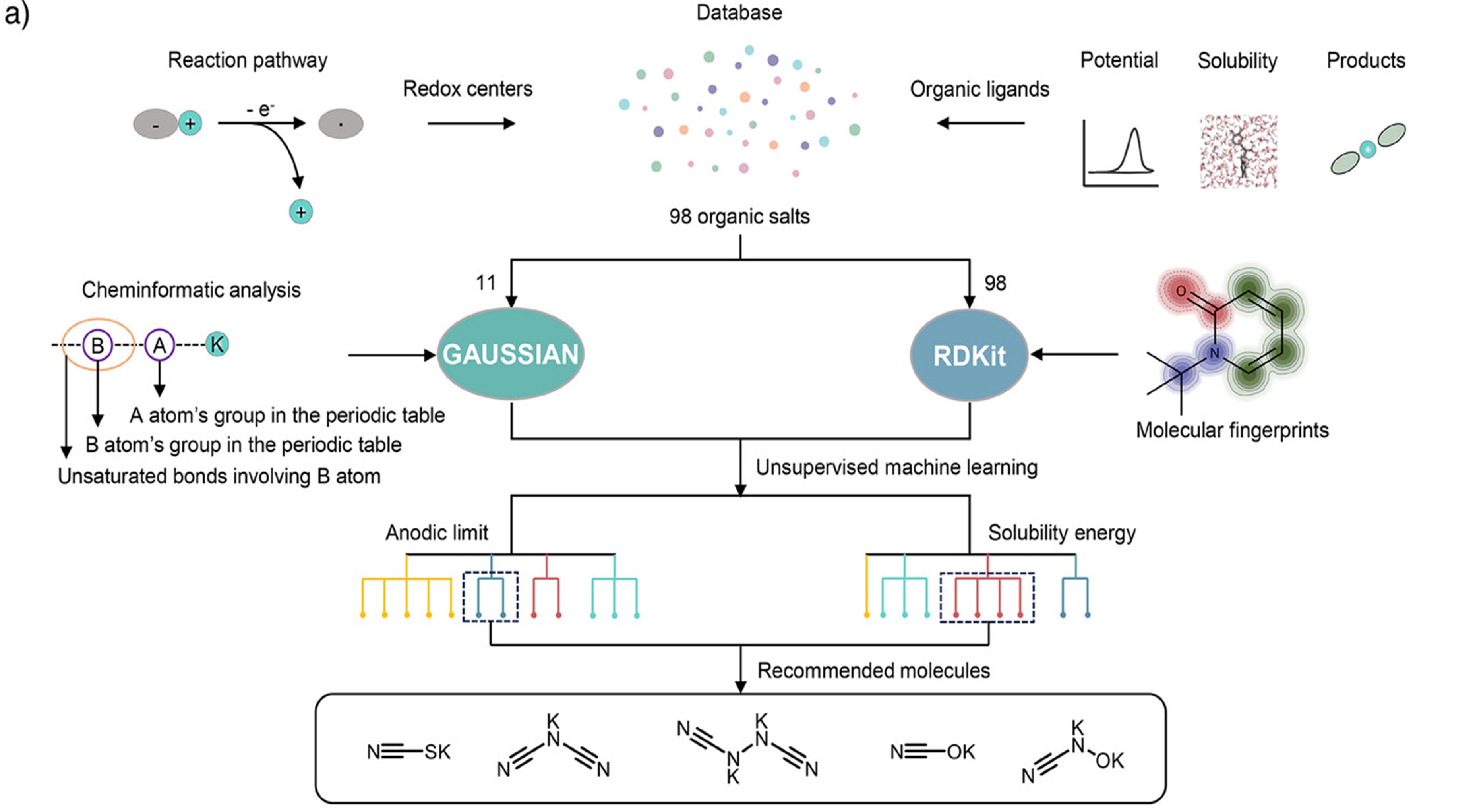针对钾离子电池活性钾严重短缺的瓶颈,团队出“无损伤电解液补钾”策略。运用无监督机器习与化学信息学方法,构建22维分子描述符体系,通过层次聚类从98个分子中优选硫氰酸钾(KSCN)。该盐在约3.6 V电位下分解释放活性钾,其配体二聚生成的(SCN)2更可促进钾离子脱溶剂化,在硬碳|K0.5Mg0.15[Mn0.8Mg0.05]O2软包电池中实现容量提升约三倍,突破钾离子短缺的技术壁垒。