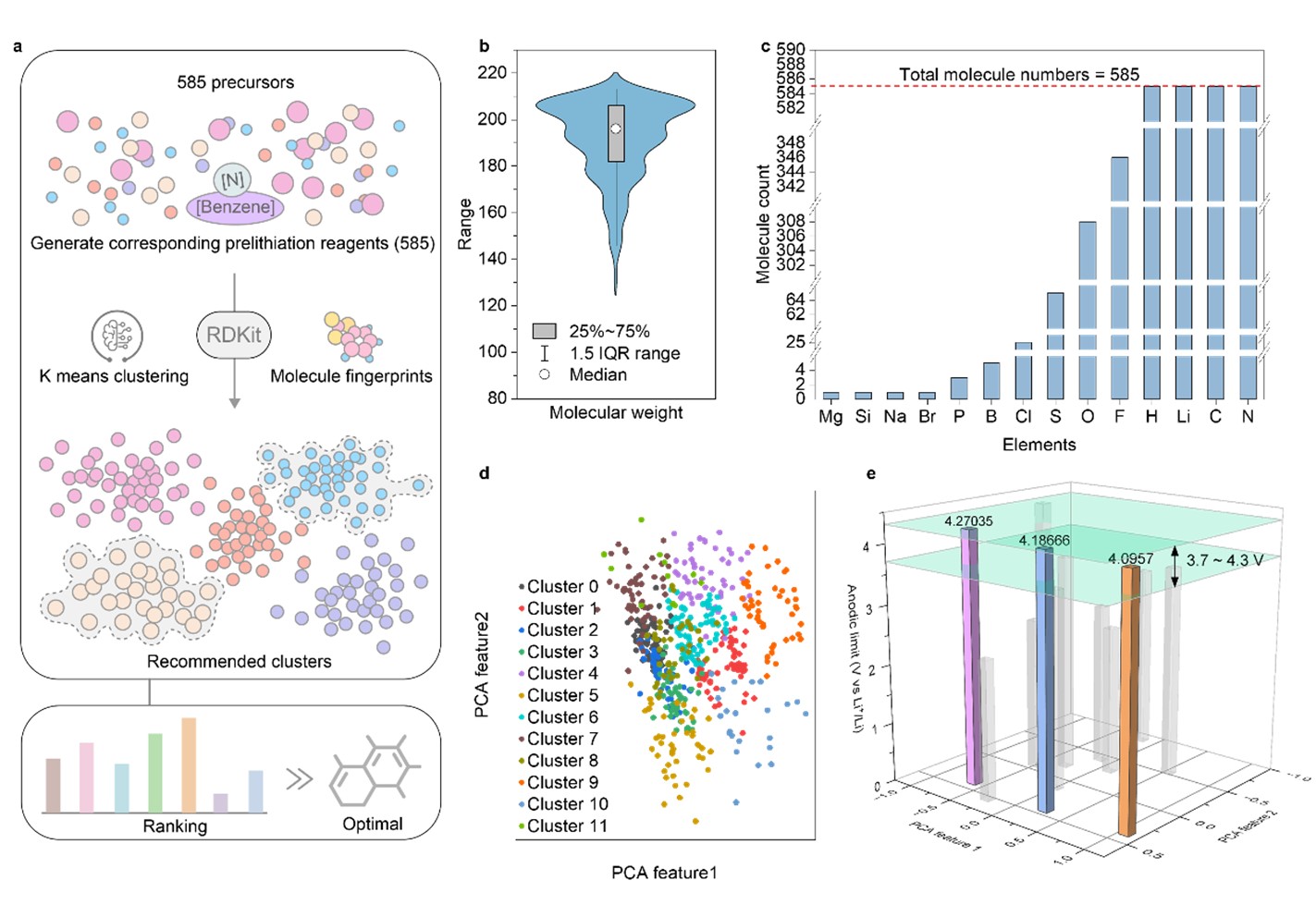 传统四价碳(C)基牺牲型补锂剂受限于高分解电位、电极相容性差等问题,难以融入现代电池工业体系。成人tv 高悦课题组独辟蹊径,将机器学习与有机电化学深度融合,开创“AI+电池分子工程”新范式。团队以硫(S)、氮(N)、硼(B)等非传统元素为中心,成功预测并合成了一系列具有自主知识产权的新型有机功能分子,实现了电池寿命修复、能量密度提升与界面副反应抑制等多重目标,系统构建了从算法筛选到产业验证的全链条创新体系。