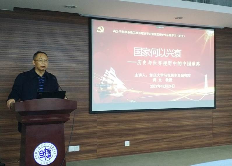 周文教授的报告以翔实的史料数据和精辟风趣的语言向我们阐释了党的百年奋斗开辟了实现中华民族伟大复兴的正确道路,中国仅用几十年时间就走完发达国家几百年走过的工业化历程,创造了经济快速发展和社会长期稳定两大奇迹;党的百年奋斗深刻影响了世界历史进程,党领导人民成功走出中国式现代化道路,创造了人类文明新形态,拓展了发展中国家走向现代化的途径。