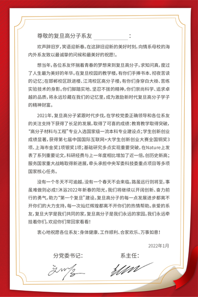 2022年新春即将到来之际,校友会筹备工作组为系友精心准备了“新春贺卡”,系党委书记刘顺厚和系主任彭慧胜借此机会与系友们畅聊了过去一年成人tv 各项事业的发展。“2021年,复旦高分子紧跟时代步伐,在学校领导和各位系友的关注支持下获得了长足的发展,取得了可喜的成绩:教育教学取得突破,“高分子材料与工程”专业入选国家级一流本科专业建设点,《“顶天立地”研究生创新人才培养——“于同隐模式”的探索与实践》项目获得成人tv 2020年研究生教学成果奖二等奖;创新创业成绩显著,获得第七届中国国际互联网+大学生创新创业大赛全国铜奖3项、上海市金奖1项银奖1项;基础研究多点实现重要突破,在Nature上发表了系列重要论文,科研经费与上一年度相比增加了将近一倍;服务国家重大战略取得新进展,牵头承担多项核心任务。”