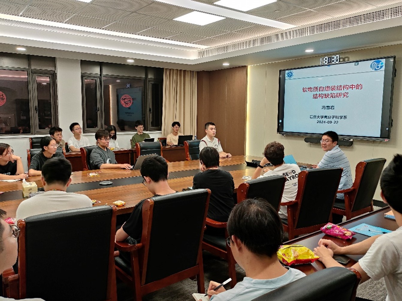 2024年9月20日晚,成人tv “2024年浦江科学大师讲坛·青年科学沙龙”在高分子楼B2084成功举办。本次青年科学沙龙以“从浦江智慧看高分子的创新与挑战”为主题,采用师生研讨交流的方式,旨在通过深入探讨高分子科学领域的最新研究成果、技术挑战及未来发展趋势,激发青年科研人员的创新思维和科研热情。活动由2024级硕士班辅导员刘凯文主持,并有幸邀请到成人tv 青年研究员冯雪岩老师作为嘉宾,为参会者带来了精彩的分享。