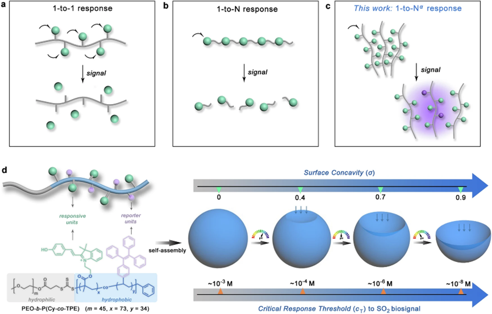 图1. (a-c) 聚合物的传统信号响应模式(1-to-1和1-to-N);(d) 通过调节纳米碗膜凹陷度实现对生物信号的非线性响应模式(1-to-Nα)