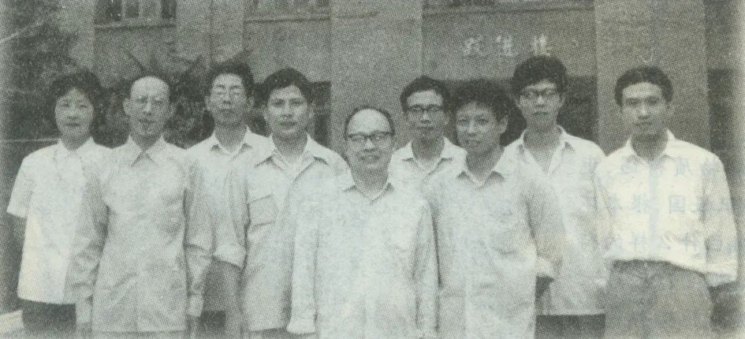 1980年代,于同隐先生和他培养的研究生们在跃进楼前合影。于同隐(中);左起一至四:程为庄、董描升、杜强国、徐又一;左起六至九:黄骏廉、葛明陶、杨玉良、姜传渔