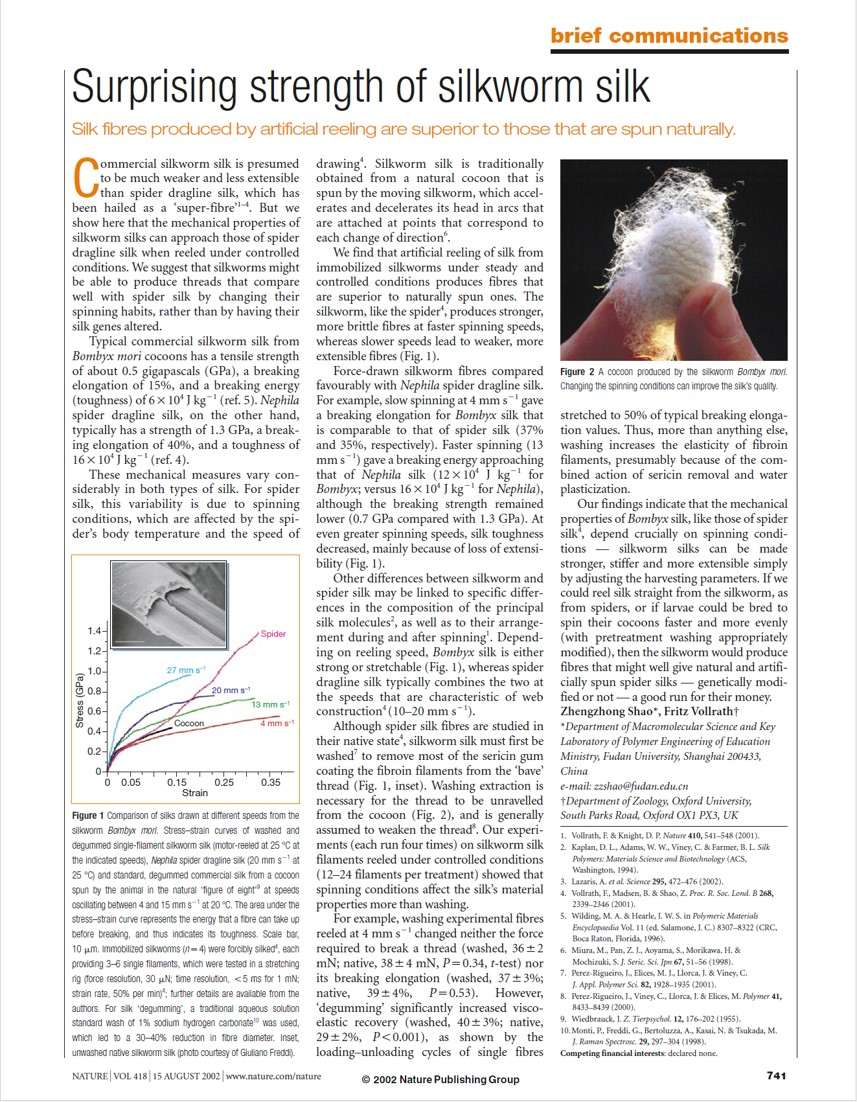 2002年8月15日,邵正中关于蚕丝的研究成果以简讯形式在Nature上发表,这也是中国第一篇高分子方向的Nature论文