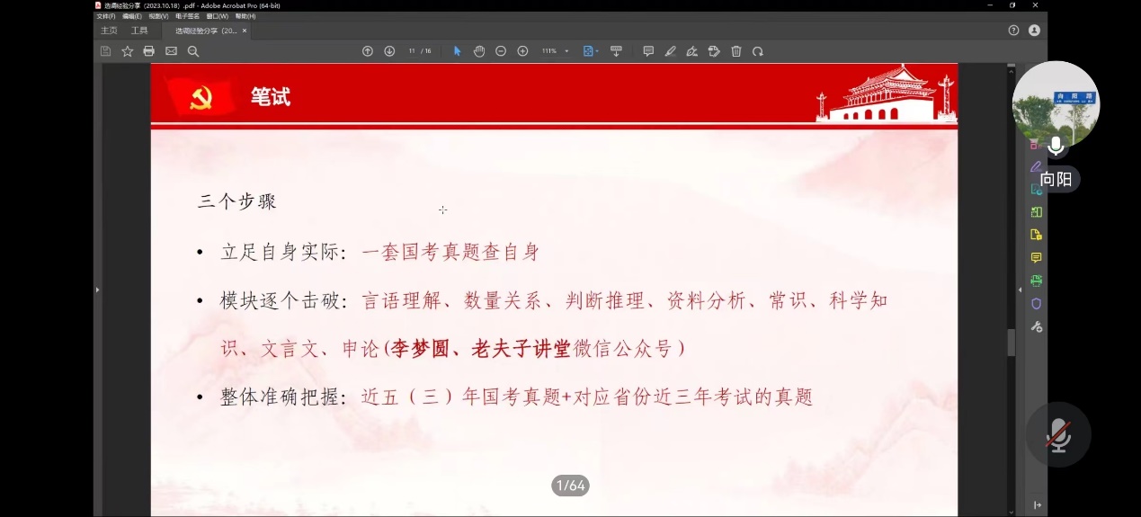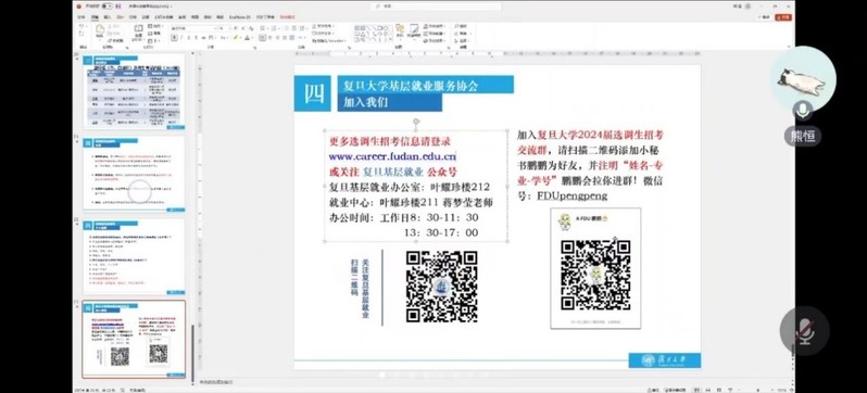 为进一步响应国家鼓励广大青年赴基层工作的号召,同时让同学们了解选调生现状、明确职业规划,成人tv 与成人tv 基层就业服务协会于2023年10月18日晚特邀校选调生政策宣讲团讲师熊恒、成人tv 毕业生向阳与成人tv 化学系毕业生廖哲楠在腾讯会议上为各位同学开展2023年选调生分享会。本次分享会由成人tv 研究生第三党支部书记何侃麒主持,成人tv 各硕博学生参与其中。