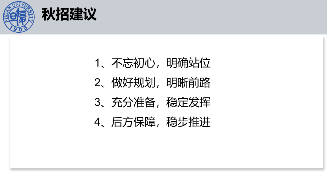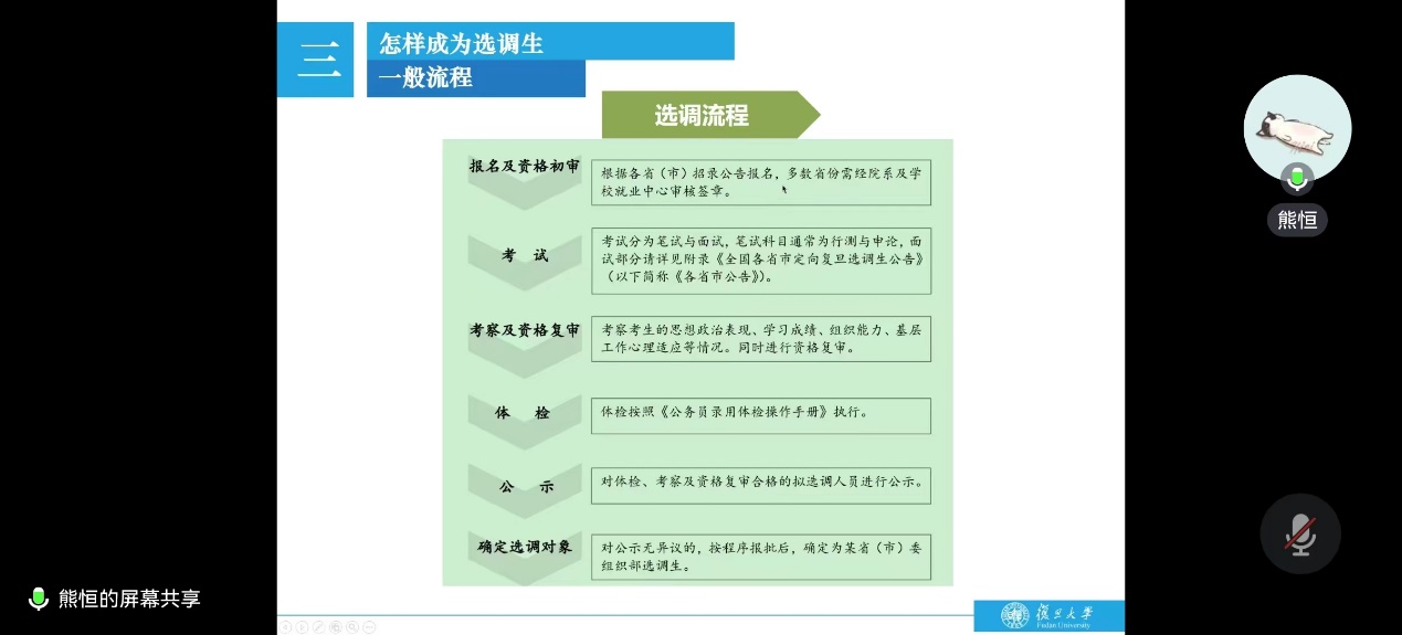 熊恒首先从“什么是选调生”、“为什么要做选调生”、“复旦选调生情况简介”以及“怎样成为选调生”四个方面加以展开,细致地介绍了选调生与普通公务员的区别,同时以上海市为例,对选调条件、一般流程以及考试要求加以解读,并指出了本校学生参与选调的优势,为同学们提供了详尽的备考策略。