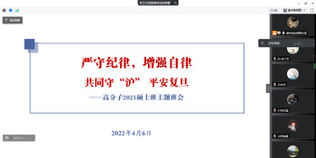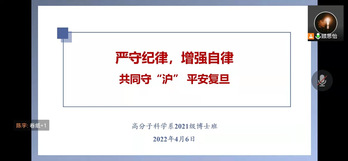 成人tv 博士毕业班、18级直博班、19级直博班和19级硕士班于4月5日晚7点联合召开主题班会,会议先由19级硕士班辅导员米震进行了防疫主题教育,然后由高分子系党委副书记兼博士毕业班、18和19级直博班辅导员王芳老师强调了学校的防疫政策。最后的答疑环节中,同学们积极反馈了一些生活上遇到的问题,也表达了大家对疫情的关切。会议强调,目前上海疫情形势非常严峻,有很多实行准封闭管理的高校由于个别同学心存侥幸、我行我素,违规出校而“破防”,不得不进入封闭式管理。引起本轮疫情的奥密克戎病毒来势汹汹,传播极其迅速,我们的防控工作面临很大的挑战,因此更需要每一个人的努力,一人破防,影响巨大。成人tv 从准封闭期间开始就实行气泡化管理,各气泡组件了80多支、5700多人的志愿服务队伍,累计服务6万多人次,教职工和后勤保障人员日夜工作以保障校园的安全。之前的案例警示我们,在非常时期,更需要严守纪律、增强自律。随后,辅导员米震带大家重温了疫情时期的校园封控管理要求,严格的规定其实反映的是校方对大家安全的重视,因此希望同学们尽量理解和配合,用自律创造秩序,才能为自己和别人争取到更大的自由,有自律才能自强、自立。主题教育的最后,同学们共同发起“共同守‘沪’平安复旦”的倡议:平时注意做好个人防护,牢记“三件套”、“五还要”;遵守防疫规定,牢记守护大局,人人有责;发挥党员模范先锋作用,面对特殊时期,体现特殊担当,用心中“星火”照亮身边师生。会议的最后,由王芳老师带领大家认真阅读学校的防疫政策并进行答疑。王芳老师强调,复旦江湾校区落实“足不出楼”的政策,是为了将病毒传播阻断在尽可能早的阶段。对于同学们生活上的诸多不便,院系表示非常理解,并积极与学校沟通,在遵守疫情防控管理规定的前提下尽量帮大家解决,并且重点关心大家“买药难”的问题,转达了校医院的相关解决方案。针对目前在校园管理中出现的问题,王老师再次强调了纪律的重要性,呼吁同学们配合老师和志愿者的管理,自觉检测核酸,营造和谐的宿舍生活环境。同时,王老师也向大家介绍了学校发起的“导师关爱活动”,充分体现了学校对校内和校外学生身心健康的关怀。