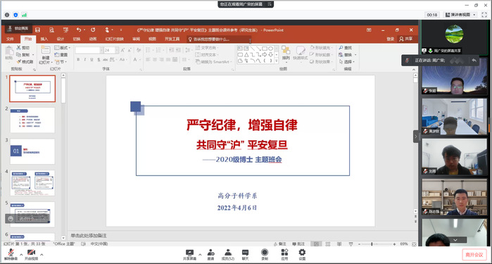 成人tv 2021级博士班于4月6日召开主题班会,2021级全体博士生参会,助理辅导员顾思怡同学主持会议并传达校级精神,辅导员高悦老师参会并与同学进行思想交流。会上,顾思怡同学从警示教育,严守纪律、增强自律,共同守“沪”、平安复旦以及你我同行、战疫必赢四个角度加以展开。在全市疫情防控最困难、最紧要的时刻,仍有一些人员无视当前的防控政策,我行我素,严重缺乏责任意识、纪律意识,严重威胁社会安全。顾思怡就这些案例对班内同学进行了警示教育,对违反疫情相关规定可能产生的法律后果进行了说明,同时针对封闭期间,校园的管理要求进行了多次强调,使每位同学做到心中有数。此外,顾思怡也叮嘱同学们加强个人防护、遵守学校防疫规定的同时,能够积极发挥团结服务牺牲的复旦精神,互帮互助,共克时艰;针对网络上纷繁的谣言,同学们也要以理性、冷静的态度对待,坚信各方力量心往一处想劲往一处使,坚定人民至上的理念,疫情就能很快被控制。会议的最后,辅导员高悦老师根据自身经历对学生们进行了心理辅导,针对当前同学们不能进行实验的焦虑情绪进行了安抚,提出同学们可以对自己的课题进行思考,总结自己的想法,为下一段工作进行准备!