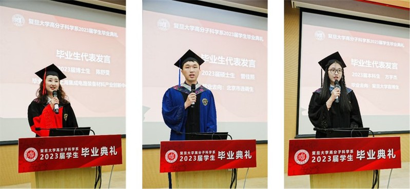 回望过去,感慨良多,毕业生们也有很多话想要抒发。博士生陈舒雯、硕士生曾佳熙、本科生方宇杰分别作为毕业生代表分享毕业感言。毕业是一个阶段的终点,更是一段新旅程的起点,希望各位毕业生们继承高分子人的精神,做一个对国家与社会有贡献的人。