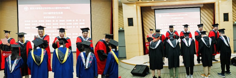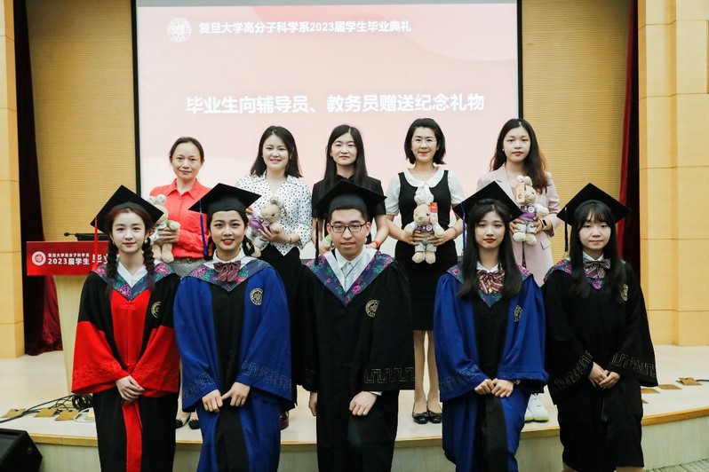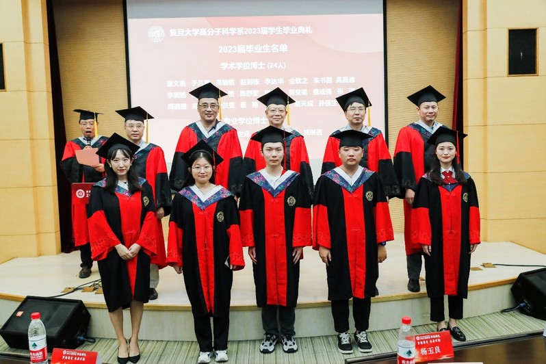 接下来,毕业典礼举行学位授予仪式,中国科学院院士杨玉良、系主任彭慧胜、系学术委员会邵正中、汪长春、聚合物分子工程国家重点实验室主任丁建东共同为全体毕业生拨穗。副系主任杨武利老师宣读2023届毕业生名单。