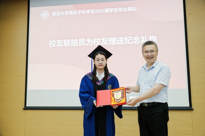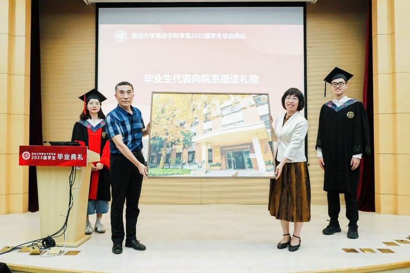 博士毕业生周璐璐和本科毕业生陆宇韬作为学生代表向高分子系赠送礼物,是一幅邯郸校区跃进楼的油画。如今复旦高分子的科研实力都得到了飞跃的提升,但我们始终不能忘却跃进楼是复旦高分子启程的港口,即将启程的高材生,更应当继承着老一辈科学家们心怀“国之大者”的特质,将个人发展与祖国发展同向同行,成为凝聚世界的青年力量。系党委书记刘顺厚、副系主任丛培红代表院系接收礼物。