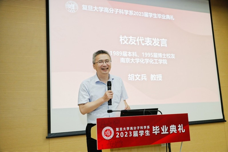 1989届校友、南京大学化学化工学院胡文兵教授作为校友代表发言。在同学们离开校园走上社会之际,他身为过来人与同学们分享了两个小故事,为同学们带来一些启发:一是年轻人要主动出击,完善自我,努力成长;二是要感念师恩,传承高分子人的精神,勇往无前,追求卓越。