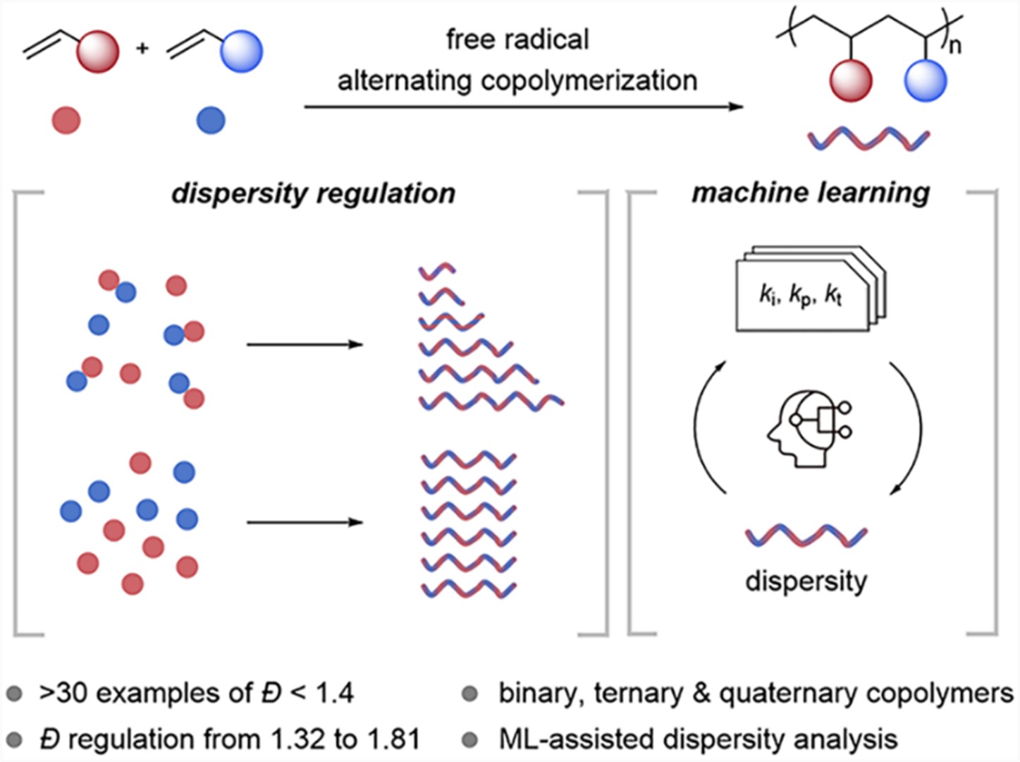 近日,成人tv 陈茂课题组(PolyMao)将蒙特卡洛动力学模拟与机器学习贝叶斯优化相结合,绘制了传统自由基共聚反应的分子量分布谱图,意外发现交替共聚反应具有产生低分散共聚物的显著趋势(MWD<1.5)。该发现与传统聚合的实验结果出现了矛盾,如苯乙烯与马来酸酐交替共聚物的MWD>2.0。长期以来,传统自由基交替共聚的机理分为两类,围绕是否由“电荷转移络合物(CTC)”作为加成单元、参与链增长展开了多年争论,绝大多数学者认为CTC占据了主导机制。陈茂团队的机器学习方案主动避免了CTC干预,发现了不同寻常的MWD趋势,揭示了在传统交替共聚中有望通过影响CTC调控MWD,首次提出了“低CTC”获得窄MWD、“高CTC”获得宽MWD的假设。以此为基础,研究团队合成了超过30种不同化学结构的交替共聚物(MWD<1.4),实现了二元、三元、四元交替共聚反应,制备了十克级的共聚产物。