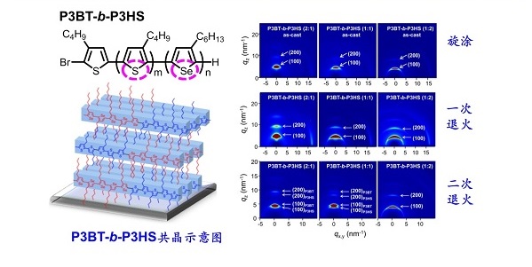 最近,成人tv 邱枫-彭娟课题组设计并合成了一系列全共轭聚(3-丁基噻吩)-聚(3-己基硒吩)(P3BT-b-P3HS)嵌段共聚物,通过将聚噻吩、聚硒吩等模型化合物引入到嵌段共聚物体系,利用嵌段共聚物微相分离的特性使体系的凝聚态结构更加丰富可调,从而进一步调控其性能。由于聚噻吩、聚硒吩两个嵌段的主、侧链结构相近,该体系能够形成共晶。从分子结构上来看,P3HS分子共平面性高,有利于载流子在分子内传输; P3BT分子在侧链方向和π-π相互作用方向排列更紧密,有利于载流子在分子间传输。因此,该体系形成的共晶兼具聚噻吩和聚硒吩的优点,在未经任何热退火或溶剂退火情况下,其载流子迁移率高出同等条件下各自均聚物、共混物和无规共聚物一个数量级以上。
