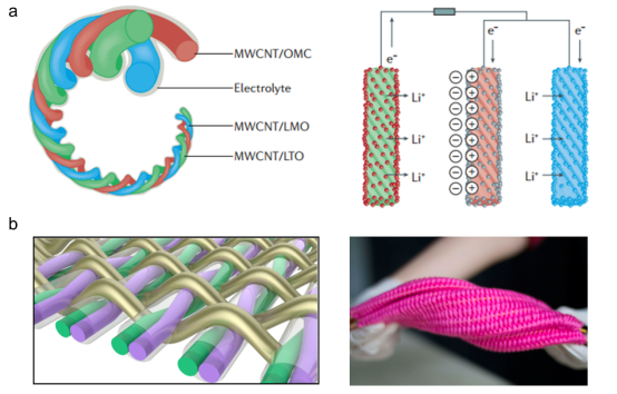 a, 纤维状储能器件的结构和工作机理示意图;b, 纤维状储能器件编织成柔软的织物