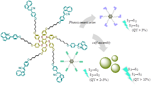 最近,成人tv 朱亮亮课题组报道了一种由氰基二苯乙烯修饰薁和六硫苯母核组成的分子结构合成和光物理研究,以展示一种能够大幅度增强的多波长的反卡莎规则发光性质。这种化合物结构采用来类似树冠状大分子的设计原理,充分利用氰基二苯乙烯修饰薁和六硫苯母核之间的荧光共振能量转移(FRET)过程,将六硫苯磷光发射潜力充分转移到6个含薁的端基上。同时,利用六硫苯的聚集诱导发射(AIE)活性,使得整个分子在聚集态层面的发光强度得到了进一步增强。这两种因素作用到一起,能够使通过薁发色团展现的反卡莎规则发光的量子产率(QY)放大约15倍。与常规前体相比的物质。此外,该系统中的发光还可以通过质子化作用、光异构和溶剂优化选择等多种因素进行智能调节。该化合物掺杂的聚合物基薄膜材料依旧能够保持增强的反卡莎规则发光性质,为先进固态发射材料的发展提供了新的视角。