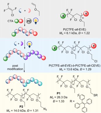 可逆-失活自由基聚合(RDRP)为丙烯酸酯、苯乙烯等常规无氟单体的活性聚合提供了重要手段。然而,这些方法对于三氟氯乙烯(CTFE)这样的氟代乙烯仍非常困难,甚至被研究人员称为“假活性”。此外,CTFE本身沸点低(-26.2 ℃),聚合通常在高温高压下进行,限制了普通实验室对其相关产物的研究。最近,成人tv 、聚合物分子工程国家重点实验室的PolyMao(陈茂)课题组通过采用光催化可控活性聚合的方式,在室温常压的温和条件下成功实现了主链含氟交替共聚物的精确合成,并可通过扩链和后修饰获得各种嵌段交替聚合物(图1)。