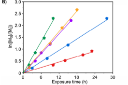 图2 CTFE和乙烯基醚(VEs)的交替共聚动力学研究。A)CTFE(实心点)与VE(空心点)的聚合度与时间的关系。B)ln([M]0/[M]t)与光照时间的关系,[M]0和[M]t分别代表VE在0,t时间下的单体浓度。不同颜色点代表不同的VE单体:SiBVE (绿), EVE (黄), IBVE (紫), BVE (蓝) 和CEVE (红)