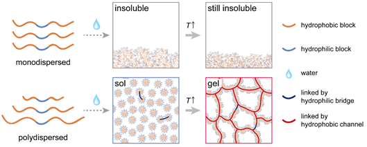 对多分散体系中不同链长的共聚物分析表明,低分子量的共聚物能够稳定胶束,促进体系溶解,阻止聚集。中等分子量及高分子量的共聚物则在凝胶化之后构成了凝胶网络的骨架。高分子量共聚物扮演骨架单元,而中等分子量的共聚物则起到网络粘合剂的作用,将高分子量骨架单元粘合成网络。