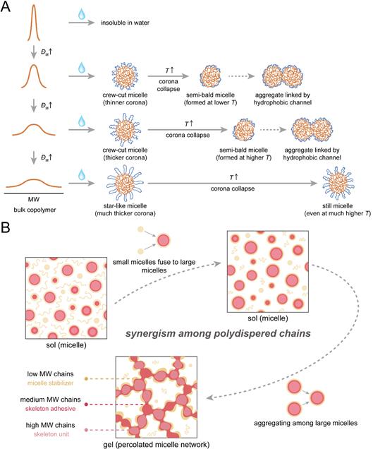 (A) ÐM影响胶束晕厚度进而影响体系热致凝胶化行为;(B) 多分散体系中不同分子量的共聚物链的协同效应