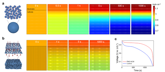 利用COMSOL软件,为二维多孔片和传统浆料涂覆法所用的微球建立了两种模型,对电极中的离子传输进行了动力学模拟。在相同的电流密度下,对于无序堆砌的颗粒,同样的锂离子消耗,1s后观察到明显的浓度梯度,5s后迅速恶化。直到500s后浓度梯度才趋于稳定,直到此时,电化学反应消耗的锂离子与扩散补充的锂离子才达到平衡。而在二维多孔片中,离子扩散非常顺畅,体系在5秒内迅速达到平衡,并保持一个低的、稳定的浓度梯度。同时,因为更小的电极极化,电极的放电平台也要优于传统电极。
