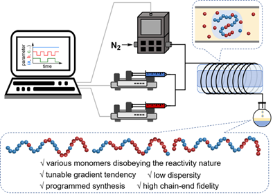 梯度聚合物的合成方法主要包括两类:一锅法合成和半间歇式加料合成。前者操作简单,梯度趋势由共聚单体反应活性、初始投料比决定,是自发形成的梯度序列,该方法对单体适用范围、梯度趋势可调范围有较大限制。后者需要连续多次添加单体,虽然可适用于更广的单体范围,但常遇到分子量分布宽、链端保真度低、重现性差等困难。与间歇式反应器(如反应瓶、反应釜)相比,流动化学反应器有大比表面积、高传质/传热效率、可模块化操作、无放大效应等优点,近年来被大量应用于化学合成。