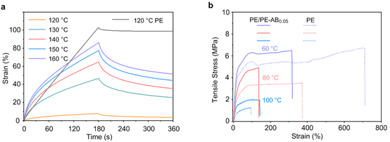 图2. 加入动态交联网络前后聚乙烯材料的蠕变和热拉伸测试