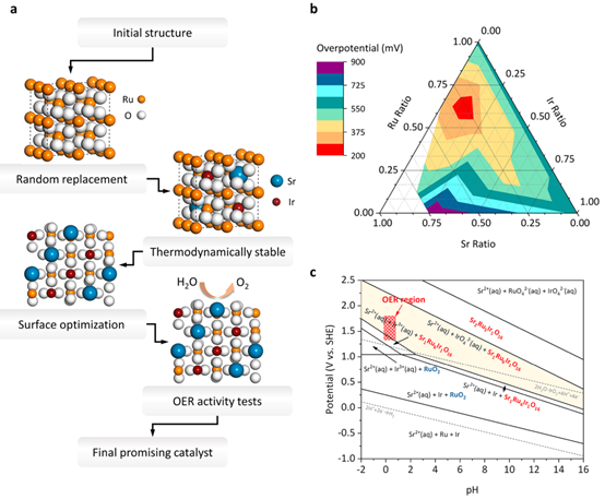 要点1. 在金红石型Ru基氧化物中掺入少量碱土金属(Sr)和Ir,通过密度泛函理论(DFT)计算筛选,优化了两种调节剂(Sr、Ir)的配比,获得了具有高活性、高稳定性的Ru位点。通过溶胶-凝胶法所得的SrRuIr氧化物催化剂在10 mA cm−2时,获得了190 mV的低过电位,并在1500小时后保持在223 mV。