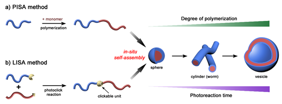 图1. 第一类(PISA)与课题组发展的第二类原位自组装策略(LISA)的机制对比。