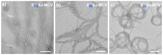 图4. MCV与不同分子量的EnAz反应组装的结果:(a) E113Az:单股非螺旋纳米线;(b) E80Az:多股螺旋纳米线;(c) E23Az:螺旋纳米环。