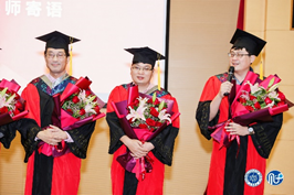 随后,毕业生们为导师代表献花,感谢导师们的悉心栽培与谆谆教诲,导师们也纷纷表达对毕业生的期许与祝福,其中周平老师深情地朗诵了一段自己创作的“三字经”:“心向善,行向律,言向乐,则健康;有责任,勇担当,广胸怀,则充实;展智慧,施勤奋,握机会,则富有”,让同学们久久难以忘怀。